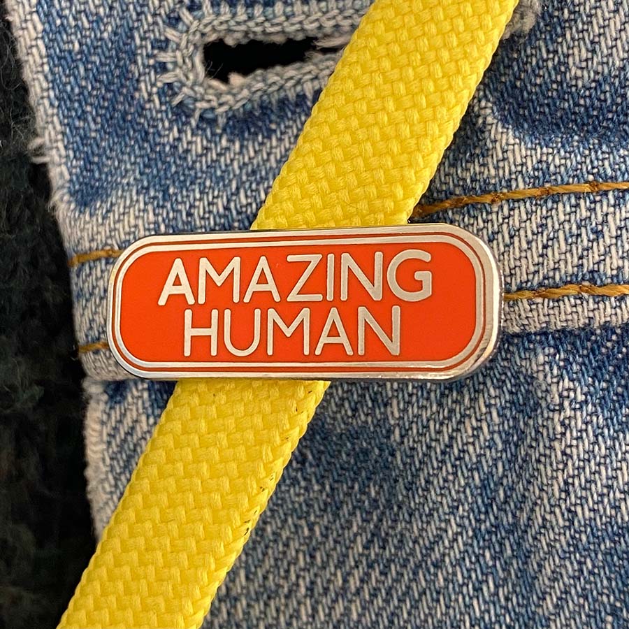 A gorgeous hard enamel pin boasting the simple words "Amazing Human" with a bright orange background. The pin comes on a backing card that we've ensured is uncoated so you can fill it in with your name and/or rank and pass it on to the Amazing Human in your life, or have us write on there for you and send it directly.