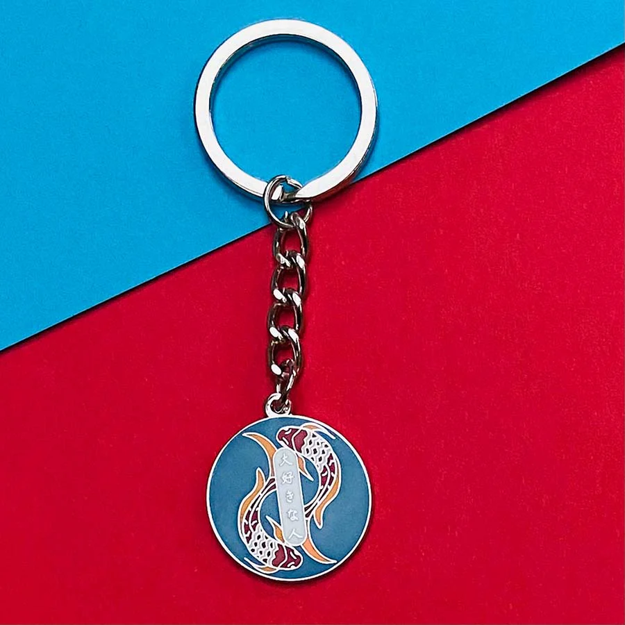 This enamel keyring says Daisukina Hito in Japanese which translates as beloved person in English. Featuring two Koi swimming in perfect harmony together.