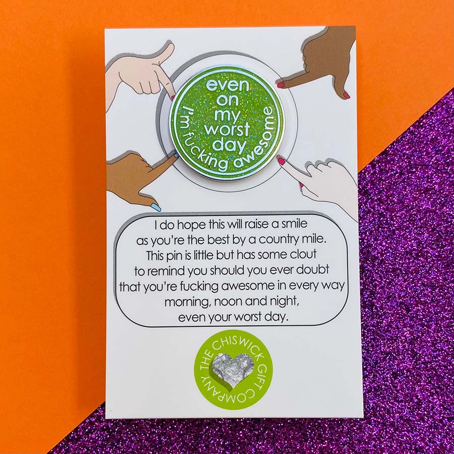 "I do hope this will raise a smile, as you’re the best by a country mile. This pin is little but has some clout, to remind you should you ever doubt, that you’re fucking awesome in every way, morning, noon and night, even your worst day."