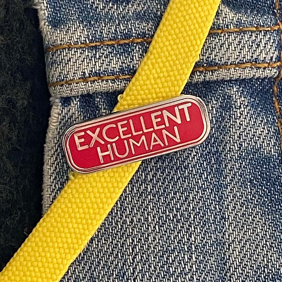 A gorgeous hard enamel pin boasting the simple words "Excellent Human" with a bright red background. The pin comes on a backing card that we've ensured is uncoated so you can fill it in with your name and/or rank and pass it on to the Excellent Human in your life, or have us write on there for you and send it directly.