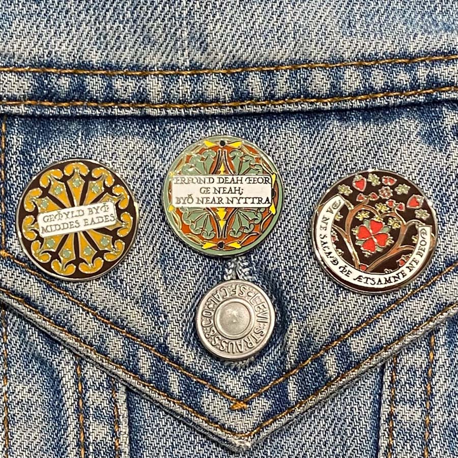 This enamel pin says "Ða ne sacað þe ætsamne ne beoð" in Old English (also known as Anglisc) which translates as "They Do Not Quarrel Who Are Not Together" in modern English.