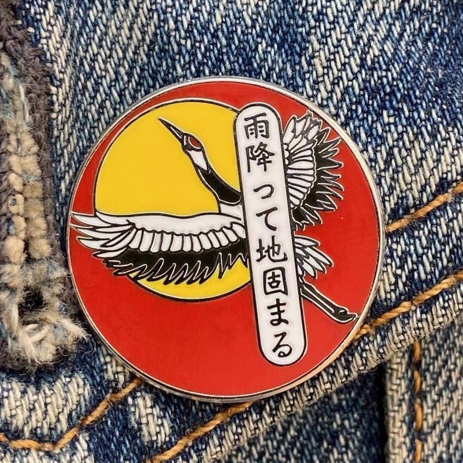 This enamel pin says Ame Futte Chi Katamaru in Japanese which translates as 'After the rain, the ground hardens' in English. Which we take to mean 'Strength Through Struggle'. Featuring a crane flying towards the sun.
