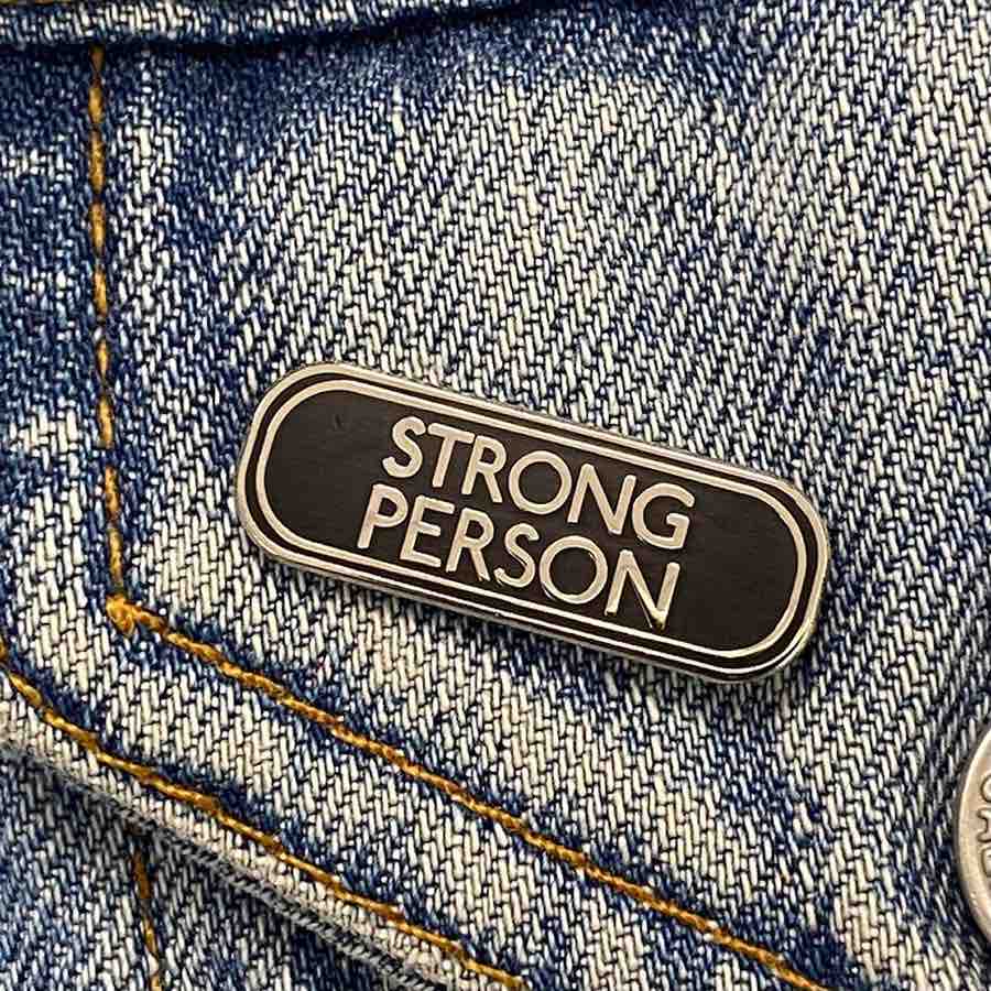 A gorgeous hard enamel pin boasting the simple words "Strong Person" with a black background. The pin comes on a backing card that we've ensured is uncoated so you can fill it in with your name and/or rank and pass it on to the Strong Person in your life, or have us write on there for you and send it directly.