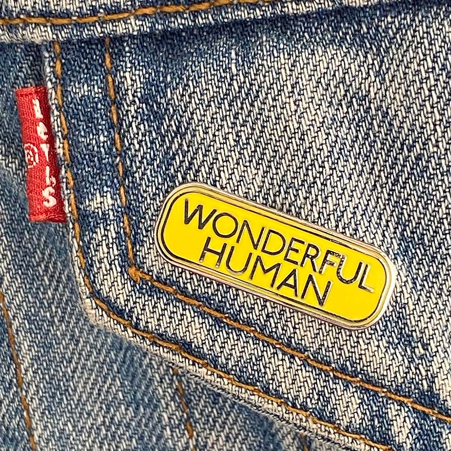 A gorgeous hard enamel pin boasting the simple words "Wonderful Human" with a bright yellow background. The pin comes on a backing card that we've ensured is uncoated so you can fill it in with your name and/or rank and pass it on to the Wonderful Human in your life, or have us write on there for you and send it directly.