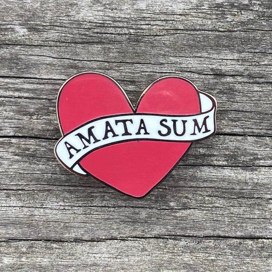 This pin badge says 'Amata Sum' which translates from Latin to English as 'I am Loved'.
