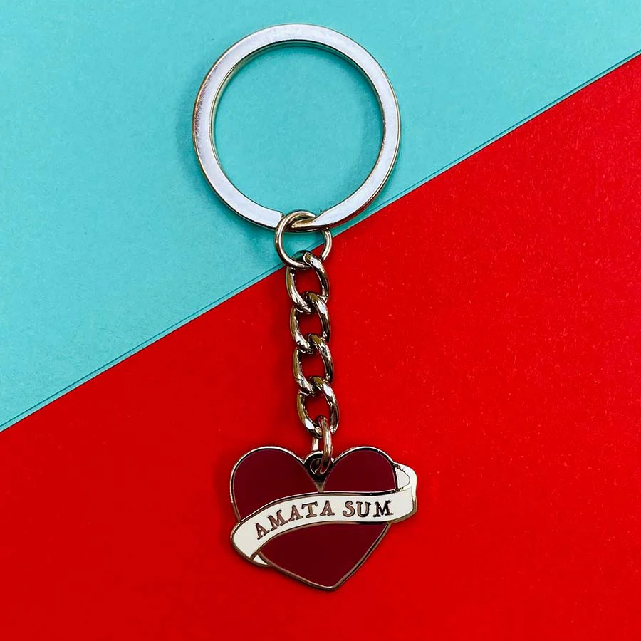 This keyring says 'Amata Sum' which translates from Latin to English as 'I am Loved'.